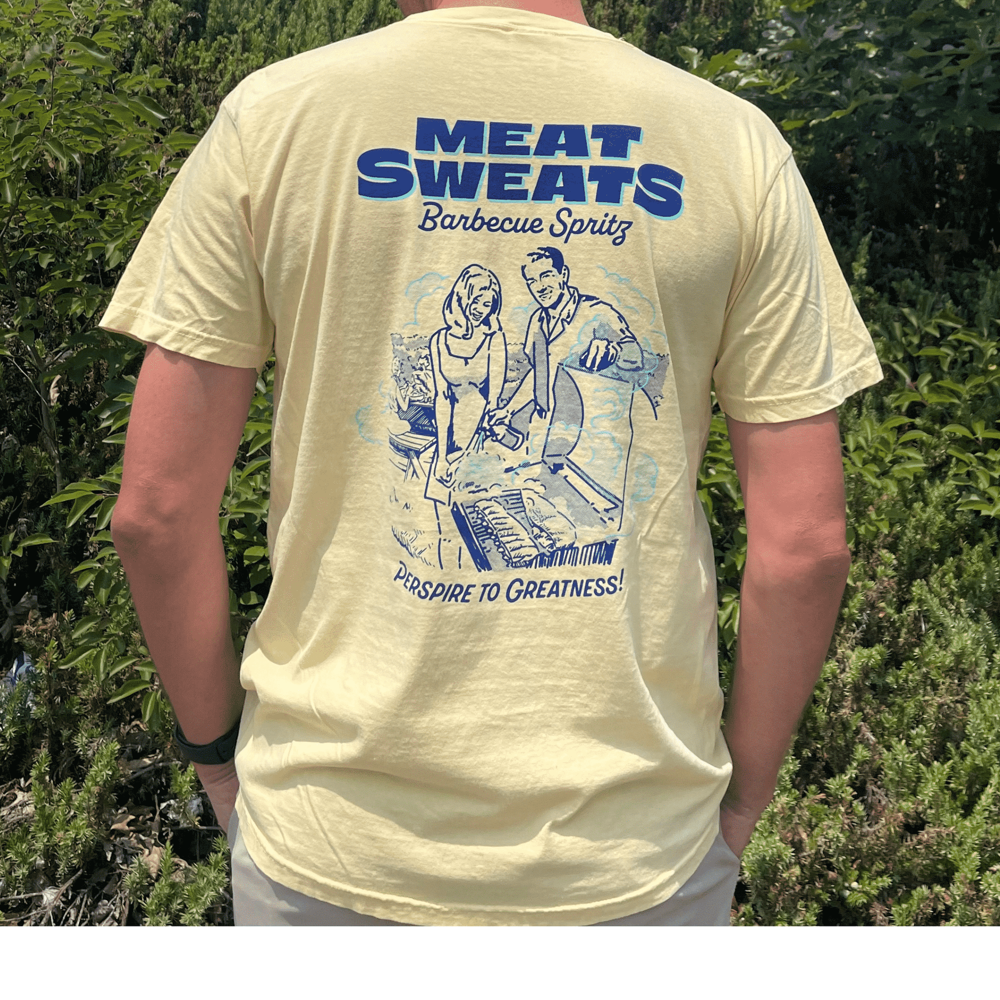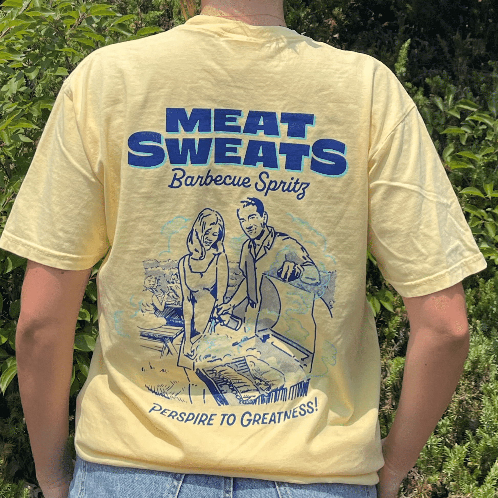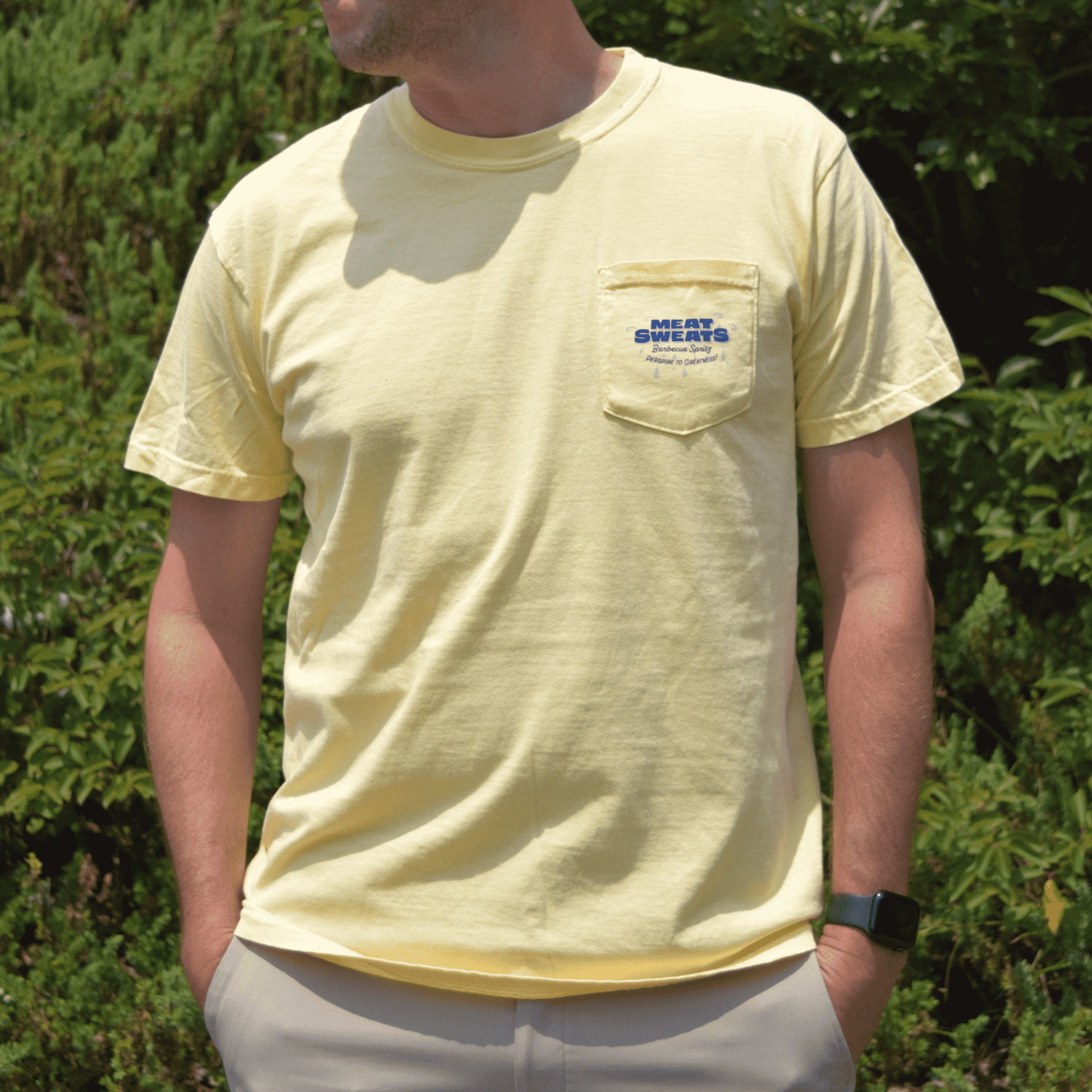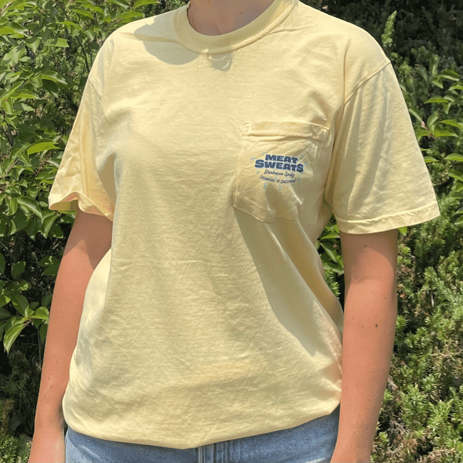 Adult Comfort Colors Unisex Pocket T-Shirt with our summer logo on the front pocket, and summer illustration logo on the back in Butter with Navy/Mint logo. 100% cotton.